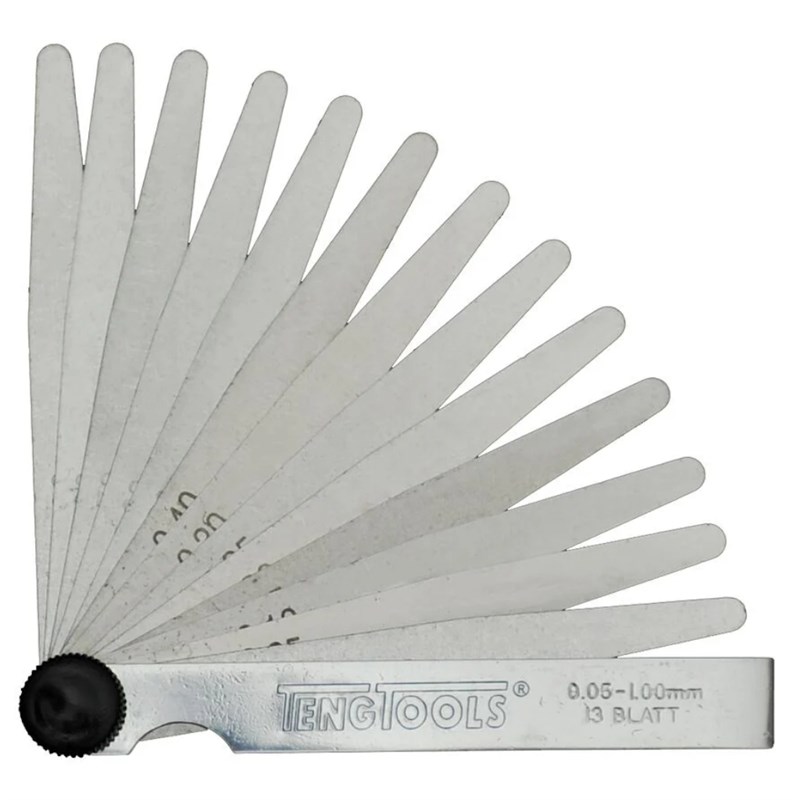 The Teng Tools FG20100 20-Blade Feeler Gauge is a precision measuring tool designed for accurate gap and clearance checks. It features 20 hardened rolled steel blades measuring from 0.05mm to 1.0mm for reliable performance across a range of applications. Supplied in a fold-up case with a tightening screw, it ensures convenient storage and secure blade positioning during use.