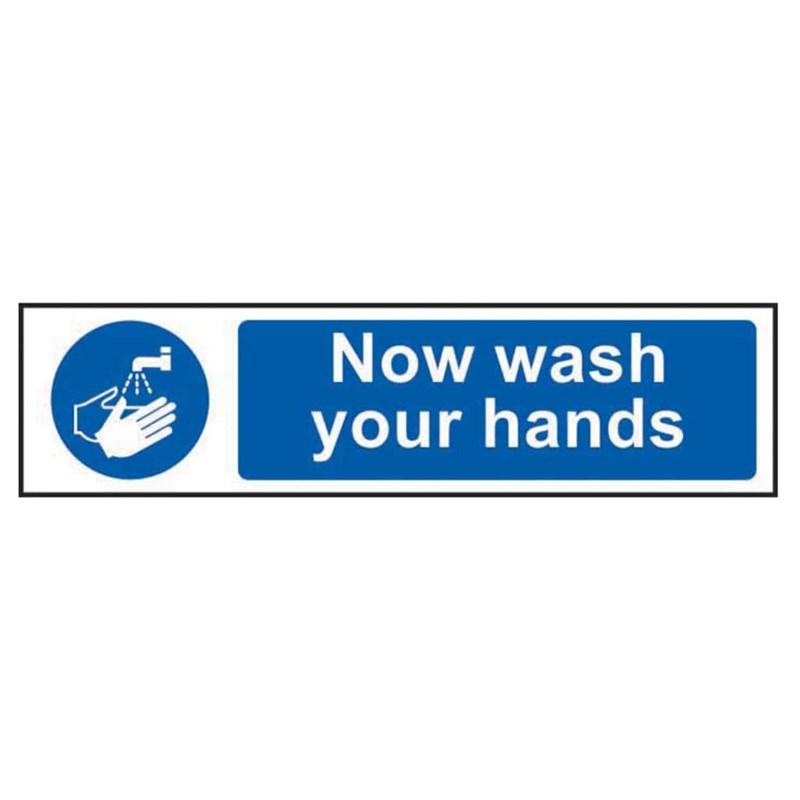 The Centurion 5014 "Now Wash Your Hands" Sign is a 200mm x 50mm mandatory hygiene sign designed to remind staff and visitors to follow essential handwashing procedures. Made from durable self-adhesive semi-rigid polypropylene, it offers quick installation and clear visibility wherever hand hygiene is required.