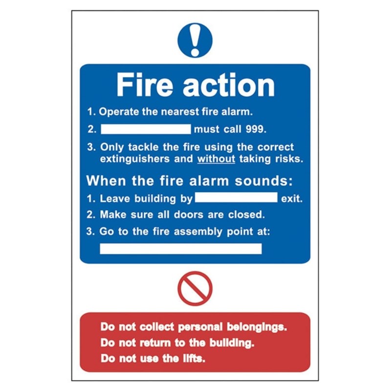 The Centurion 0165 “Fire Action” Sign provides clear, essential instructions outlining the required actions in the event of a fire or evacuation emergency. Manufactured from 1.2mm recyclable semi-rigid polypropylene, it ensures employees and visitors can quickly understand the correct procedures, supporting effective emergency response and regulatory compliance.