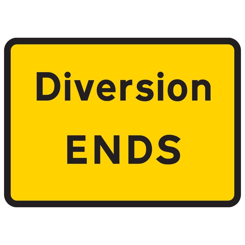 The Viz Reflectives "Diversion Ends" Road Sign is a high-visibility plate designed to clearly indicate the end of a diversion route. It highlights a reflective finish for enhanced visibility, helping drivers safely transition back to the normal route in roadworks and traffic management situations.