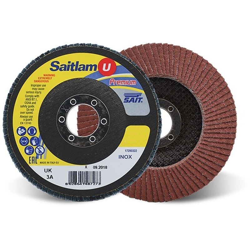 The Sait 048727 SAITLAM-UK 3A Premium Abrasive Flap Disc is part of the SAITLAM-UK family and features high quality Aluminium Oxide cloth with a glass fibre backing for additional strength and stability. Designed to prevent clogging and dulling of the wheel, it provides quality performance for longer periods and enjoys a greater lifespan.