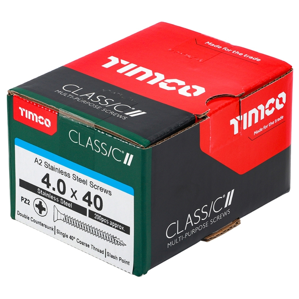 The TIMCO 40040CLASS A2 Stainless Steel Classic Multi-Purpose Screw is a high-performance fixing that combines the proven Classic design with the superior corrosion resistance of A2 stainless steel. It highlights dependable performance in aggressive or coastal environments and secure fixing into softwoods, pre-drilled hardwood, chipboard, MDF and plastic. Designed for strength and longevity, it delivers consistent holding power where standard plated screws are unsuitable.