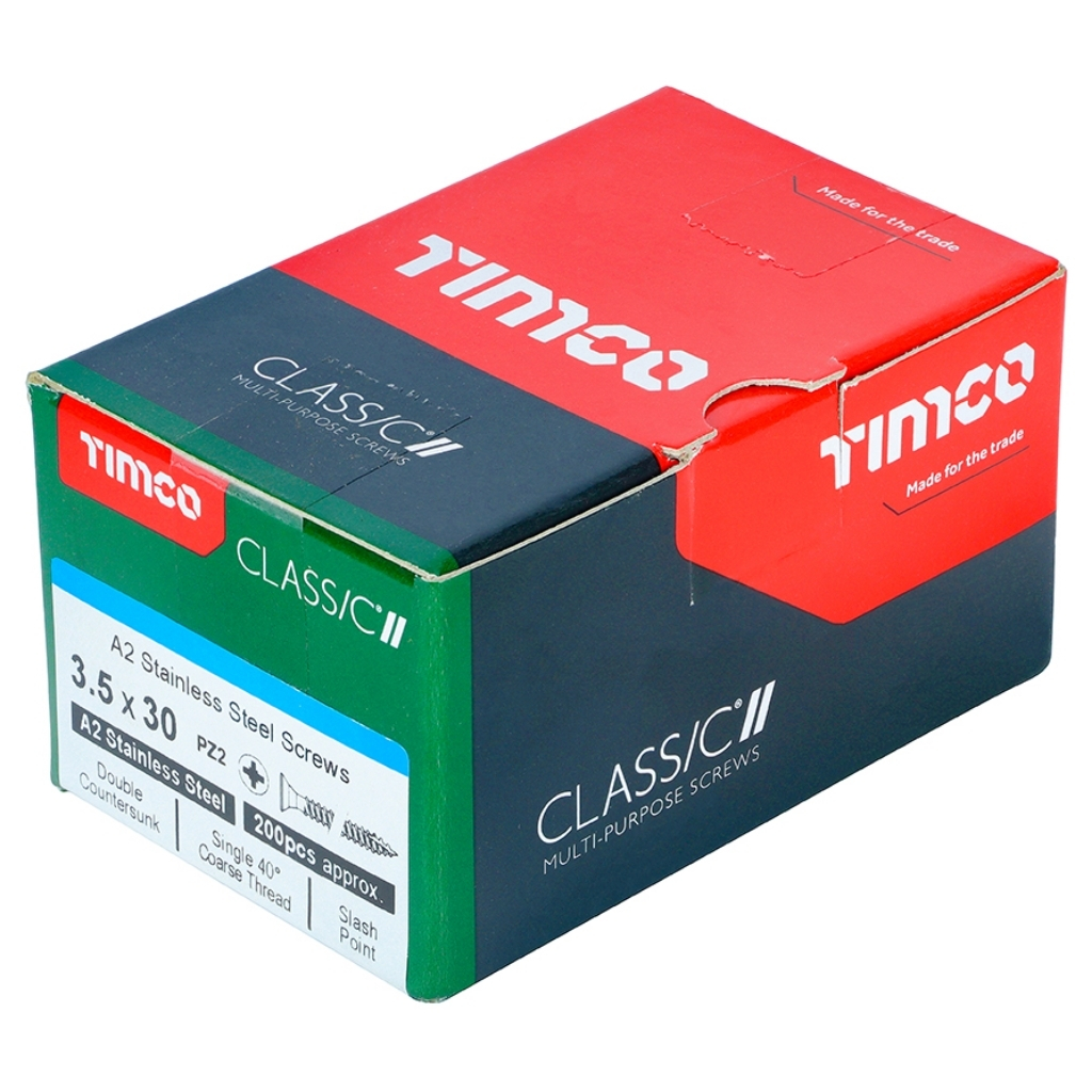 The TIMCO 35030CLASS A2 Stainless Steel Classic Multi-Purpose Screw is a high-performance fixing that combines the proven Classic design with the durability of A2 stainless steel. It highlights exceptional corrosion resistance for use in aggressive or coastal environments and dependable fixing into softwoods, pre-drilled hardwood, chipboard, MDF and plastic. Engineered for strength and consistency, it delivers secure holding power and long-term reliability where standard plated screws are unsuitable.