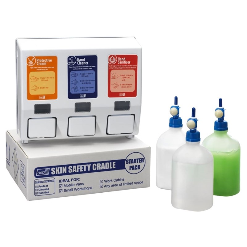 The Deb Stoko DCSP01PR Skin Safety Cradle Starter Pack is a comprehensive skincare solution designed for workplace environments. It includes a selection of pre-work creams, hand cleansers, and after-work conditioning products to help protect, clean, and restore skin exposed to industrial contaminants. Ideal for mobile workstations or areas without running water, the cradle provides convenient and hygienic access to essential skin care.