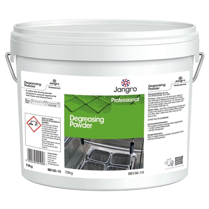The Jangro BB100-10 Professional Degreasing Powder is a highly effective cleaning solution designed to remove heavy grease, fat, and stubborn residues. Ideal for use in commercial kitchens and food preparation areas, it provides powerful degreasing action on a variety of washable surfaces and equipment. Easy to use and fast-acting, it ensures a deep clean to maintain excellent hygiene standards.