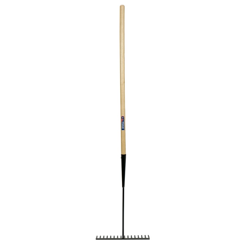 The Spear & Jackson 3886AA Heavy Duty Flat Tooth Asphalt Rake is a tough and reliable tool designed for professional tarmac and asphalt work. It highlights a strong carbon steel head with 16 flat teeth for fast and efficient material spreading, a wide 470mm (18.5") working width, and an extended tang and socket that protect the handle from heat during use.