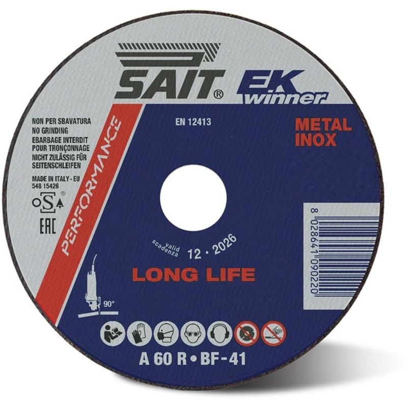 The Sait 09020 EK WINNER-TM A 60 R Flat Cutting Wheel offers excellent long life, provides a very good cutting quality as well as a clean finish and is suitable for use with portable machines. This cutting disc is works well with various materials, such as steels, alloy steels, stainless steels, non-ferrous metals.