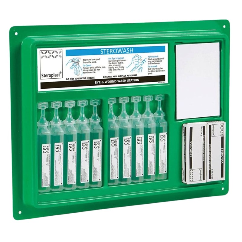 The Steroplast 1410 Sterowash Eye & Wound Wash Station is a versatile, wall-mounted first aid unit designed for the effective irrigation of eyes and wounds. Equipped with sterile saline solution pods and dressings, it provides quick access in emergencies involving dust, debris, or minor injuries. Ideal for workplaces, laboratories, and environments requiring robust first aid provision.