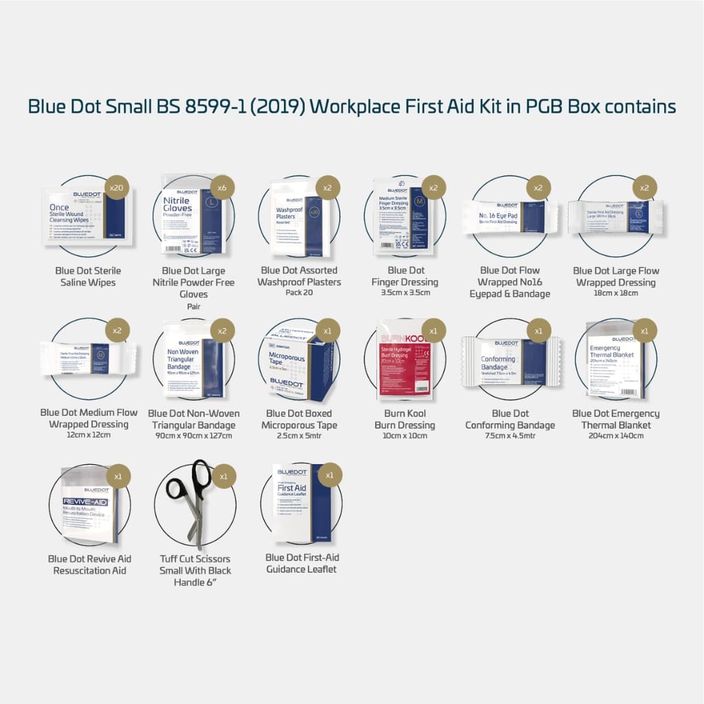 The Blue Dot S9 Small Workplace First Aid Kit is a compact and comprehensive kit designed to meet the essential first aid needs of small workplaces. Housed in a durable PGB box injuries quickly and effectively. Ideal for offices, retail spaces, and low-risk environments requiring compliant and accessible first aid support.
