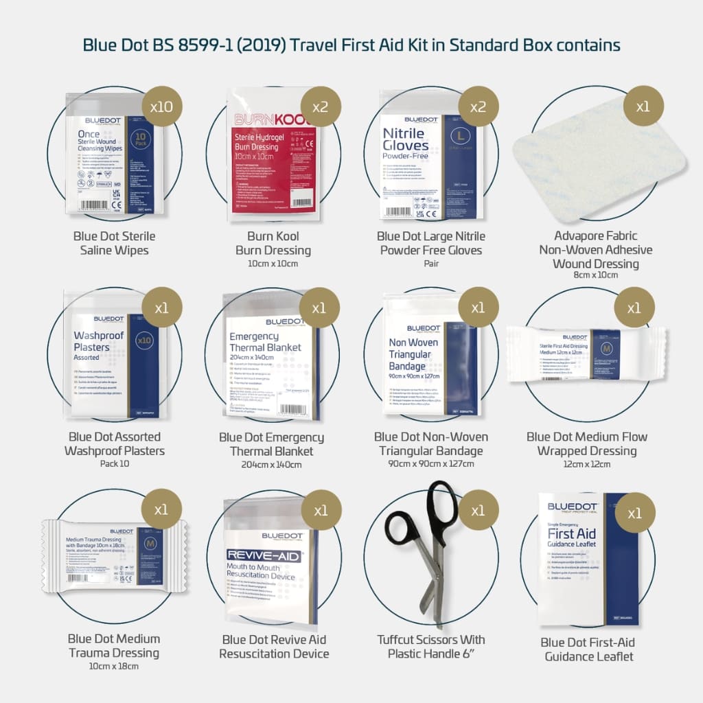 The Blue Dot T6 Travel First Aid Kit is a lightweight and portable kit designed for first aid on the go. Packed in a durable green box, it contains essential supplies to treat minor injuries while travelling or during outdoor activities. Ideal for use in cars, holidays, or day trips, ensuring peace of mind wherever you are.