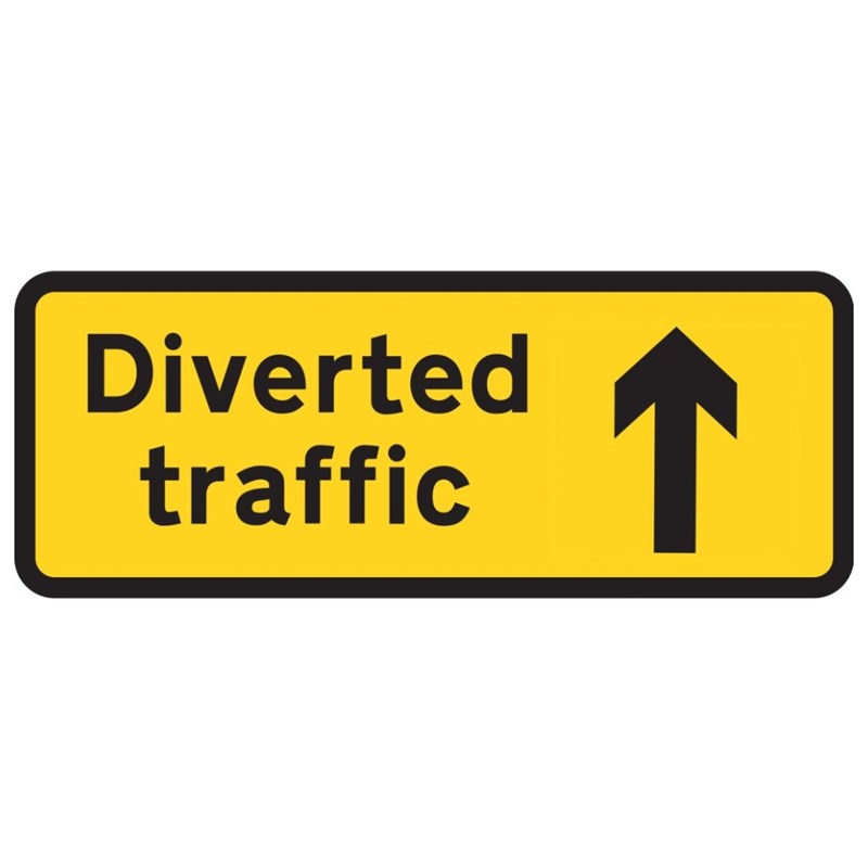 The Viz Reflectives "Diverted Traffic" Straight Arrow Road Sign is a high-visibility plate designed to direct diverted vehicles straight ahead along a designated route. It highlights a reflective finish for enhanced visibility, helping ensure clear guidance and safe traffic flow in roadworks and temporary diversions.
