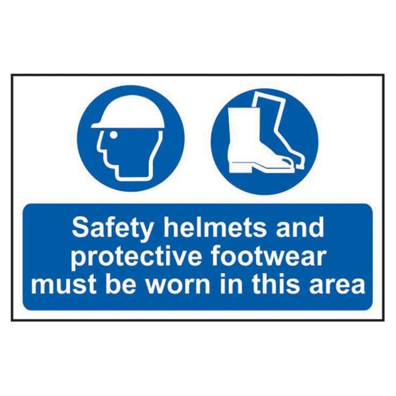 The Centurion 4001 "Safety Helmets And Protective Footwear Must Be Worn in This Area" Sign (600mm x 400mm, 1.2mm Polypropylene) is a clear mandatory safety notice designed to reinforce essential PPE requirements. It highlights the need for both head and foot protection in designated areas, helping ensure compliance and maintain workplace safety standards.