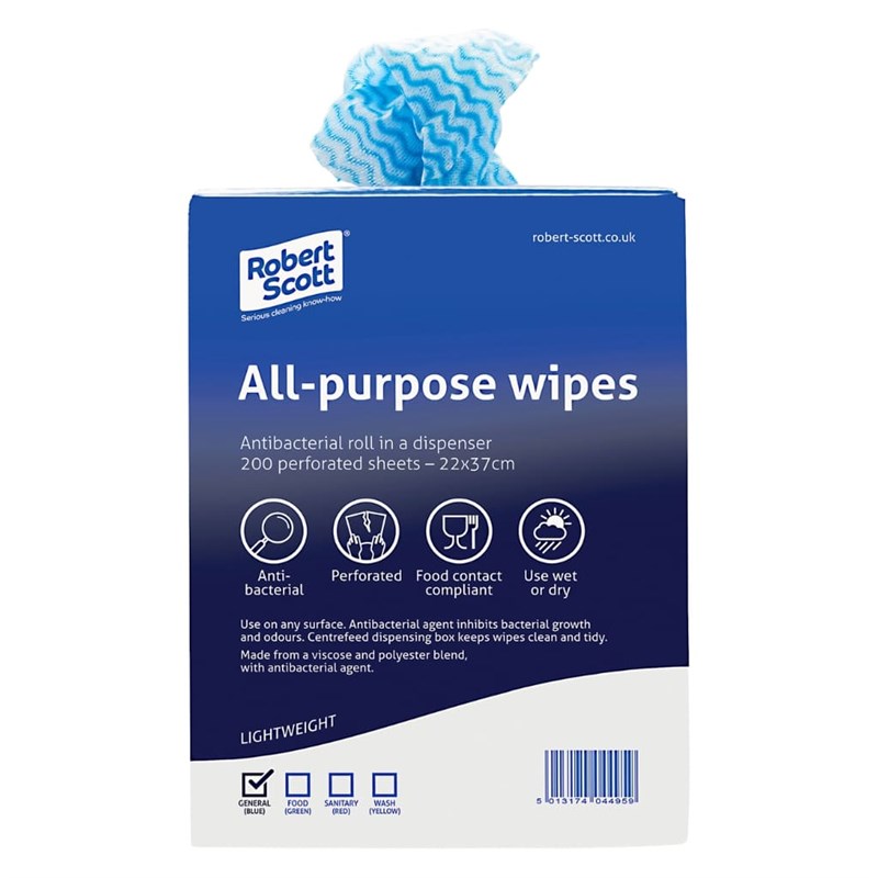 The Robert Scott 100247 All-Purpose Wipes are strong, absorbent cloths designed for a wide range of cleaning tasks. Suitable for use on various surfaces, these wipes are ideal for kitchens, washrooms, and general maintenance in commercial and domestic settings. Their durable construction ensures long-lasting performance, providing a practical and efficient solution for everyday cleaning needs.