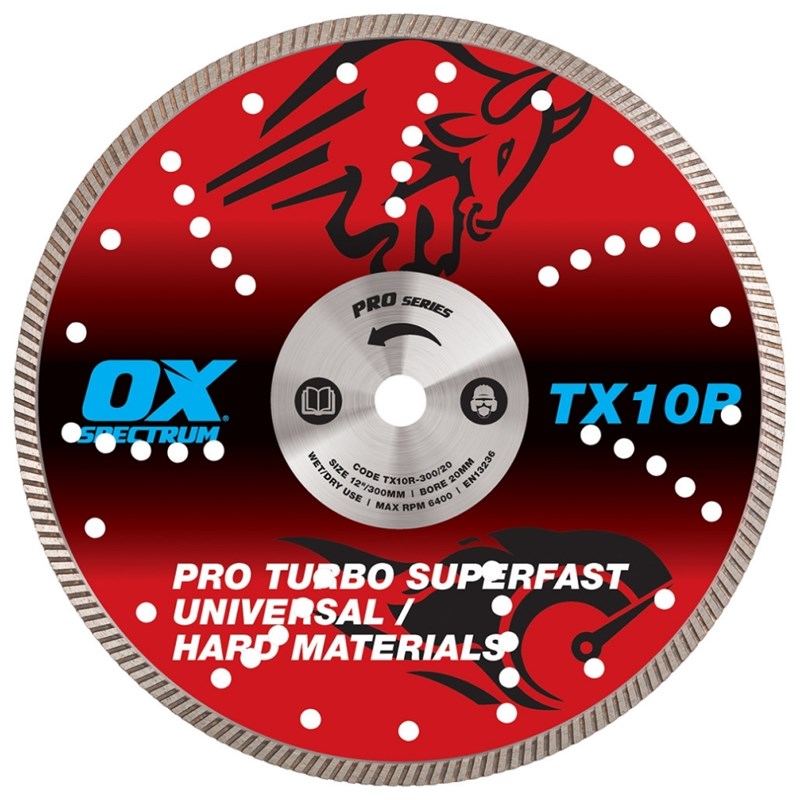 The OX TX10R-300-20 Spectrum Superior Turbo Diamond Blade is a heavy duty 300mm diamond blade engineered for fast, clean cutting across the toughest construction materials. It highlights aggressive turbo segments combined with a reinforced centre plate and integrated cooling holes to deliver speed, safety and durability under demanding site conditions. Designed for professional use, it provides reliable all-material cutting performance with 12″ disc cutters and compatible grinders.