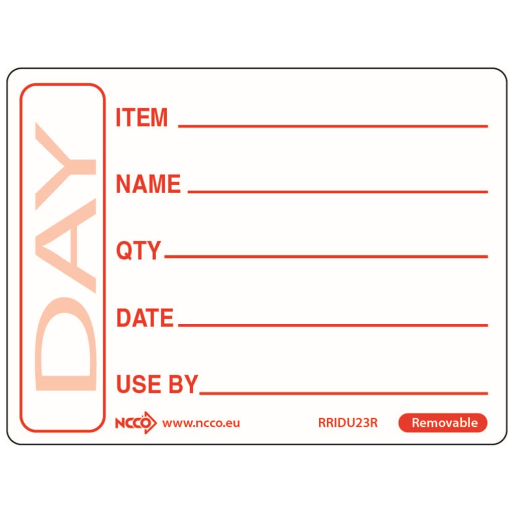 The NCCO RRIDU23R Removeable Day/Use By Labels are designed to help businesses and organisations efficiently manage expiration dates and daily use information. With a removable adhesive, these labels can be easily applied to products or containers and removed without leaving any sticky residue behind. Perfect for use in kitchens, warehouses, or offices, these labels ensure clear and visible labelling to reduce waste and improve stock management.