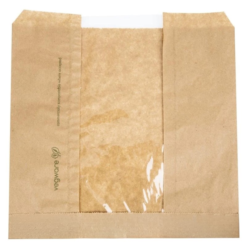 The Vegware VNWB8.5 Kraft NatureFlex Window Bag is an eco-friendly packaging solution crafted from sustainably sourced kraft paper with a clear NatureFlex window for product visibility. Fully industrially compostable, it combines strength and transparency to showcase bakery items, sandwiches, or snacks whilst maintaining freshness. Its durable, grease-resistant construction makes it ideal for cafés, delis, and retail outlets seeking a sustainable alternative to conventional plastic bags.