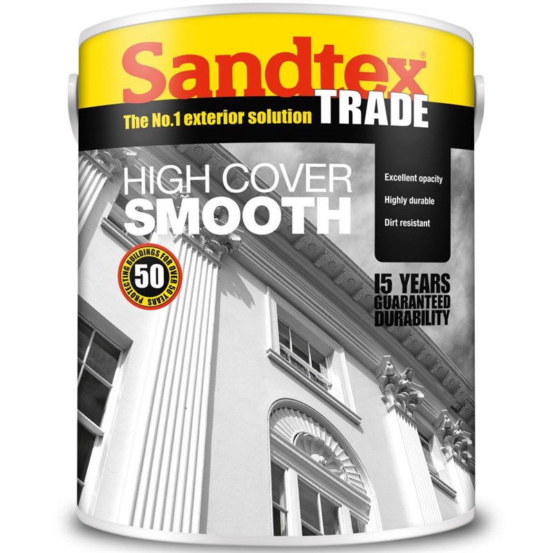The Sandtex Trade 5092816 High Cover Smooth Masonry Paint is a smooth water-based masonry paint specially formulated for the professional user, which provides a quality protective and decorative finish. Use it on exterior masonry and exterior grade building boards to achieve a durable, high opacity finish. When applied properly, Sandtex High Cover Smooth Masonry Paint provides up to 15 years of high-quality protection of brick, stone and building board surfaces.