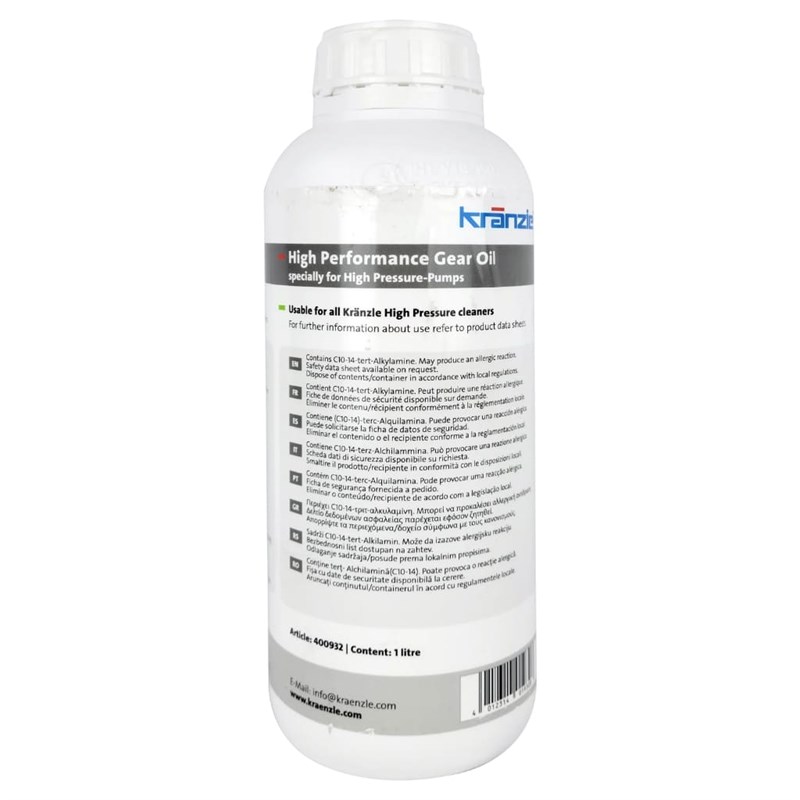 The Kranzle 400932 High Performance Gear / Pump Oil is a specially formulated lubricant designed to ensure optimal performance and longevity of pressure washer pumps and gears. Engineered for use with Kranzle equipment, it provides excellent protection against wear, corrosion, and overheating. Ideal for regular maintenance, this oil helps to maintain efficiency and reliability in demanding cleaning applications.