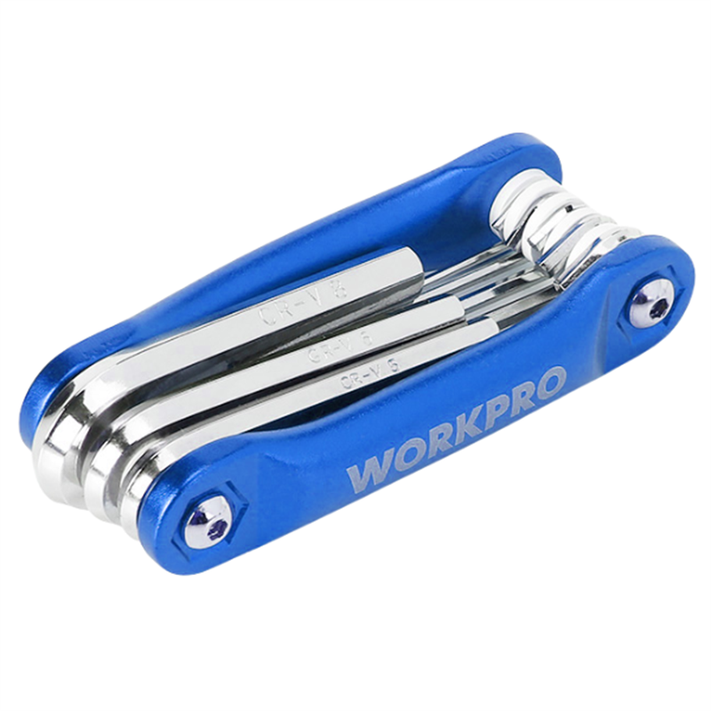 The WORKPRO WP222024 Folding Hex Key Set is an 8‑piece metric Allen key tool designed for convenient everyday use. Made from hardened chrome‑vanadium steel and housed in a lightweight aluminium handle, it provides durable performance with comfortable leverage. Covering sizes from 1.5 to 8 mm, it’s a tidy, portable solution for furniture assembly, bike maintenance and general repairs.