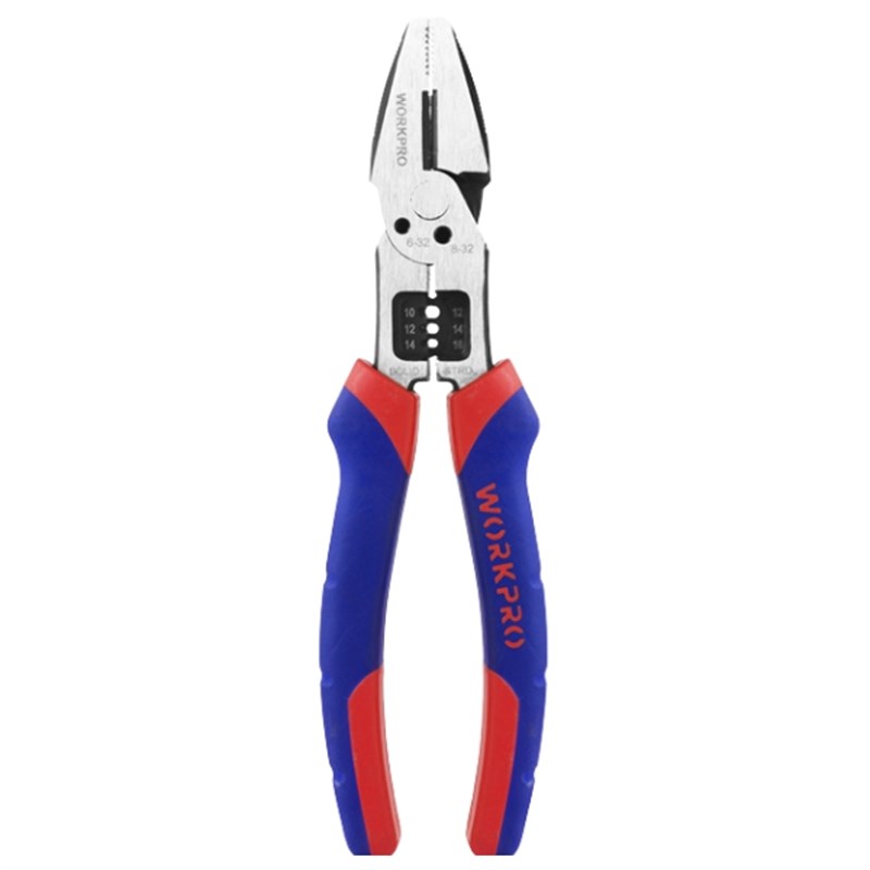 The WORKPRO W031139 All‑Purpose Linesman Pliers is an 8‑inch multi‑function electrician’s plier designed to grip, bend, cut and strip. With heat‑treated alloy‑steel jaws, integrated 10–16 AWG wire stripping and bolt cutters for #6 and #8, plus bi‑material comfort grips, it streamlines common install and repair tasks.