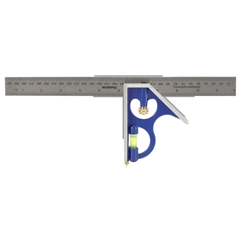 The WP264002 WORKPRO 300mm Aluminium Combination Square is a versatile measuring and marking tool for woodworking, metalworking and general layout. It features a precision‑machined die‑cast aluminium stock with an impact‑resistant acrylic vial, an etched stainless steel 300mm blade with metric and imperial graduations, and a removable brass scriber for marking.