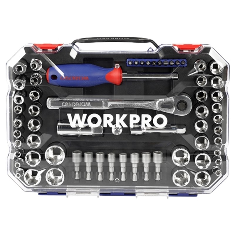 The WORKPRO W003070WE 63‑Piece 1/4" & 3/8" Drive Socket Set is a compact mechanic’s kit covering metric and SAE fasteners for vehicle repair and household maintenance. With 6‑point sockets, a quick‑release ratchet, extensions and a bit driver in a portable case, it delivers reliable turning power and organised access on the go.