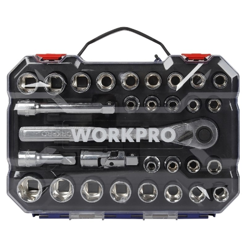 The WORKPRO W003071WE 1/2" Drive 30‑Piece 6‑Point Socket Set is a robust mechanic’s kit covering key metric and SAE sizes. With CR‑V 6‑point sockets, a quick‑release 1/2" ratchet, extensions and a universal joint in a compact case, it delivers reliable turning power for vehicle repair and workshop maintenance.