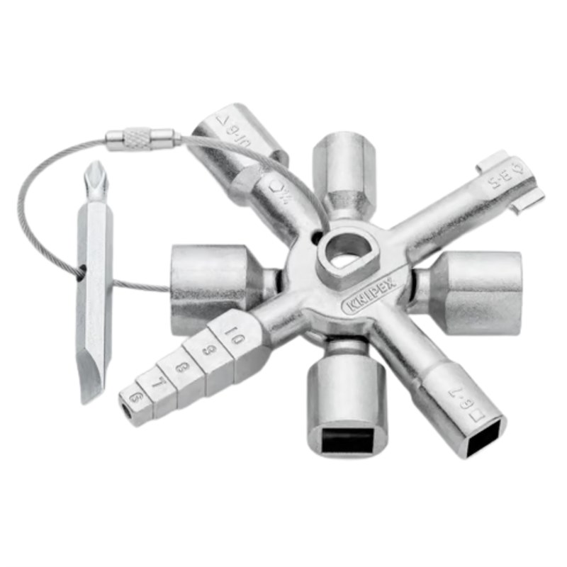 The Knipex 00 11 01 TwinKey® Control Cabinet Key is a compact, multifunctional tool designed for versatile access to various locking systems. Equipped with triangular, square, double bit, half-moon, slotted, and Phillips keys, it allows users to unlock control cabinets, operate valves, or adjust screws with ease. Its ergonomic design and strong contact area provide effective twisting power even in confined spaces.