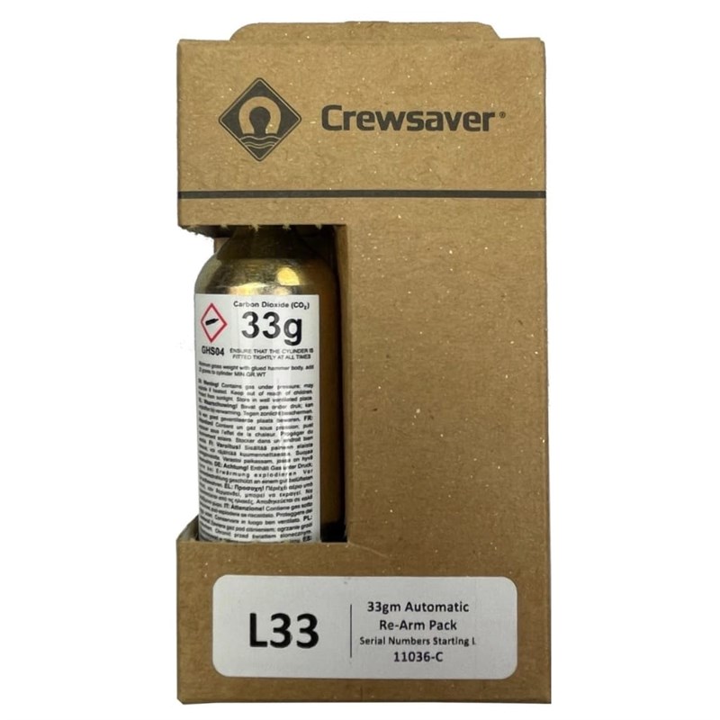 The Crewsaver Re-Arming Kit Auto 33g 11036C Crewfit L33 is designed for use with automatic lifejackets in the Crewfit range. This rearming kit includes a 33g CO2 cylinder and all the necessary components to restore functionality to the lifejacket after deployment. It is essential for maintaining your lifejacket’s reliability and ensuring it is ready for use in emergency situations. Ideal for both professional and leisure maritime users, it guarantees continued safety and compliance with industry standards.