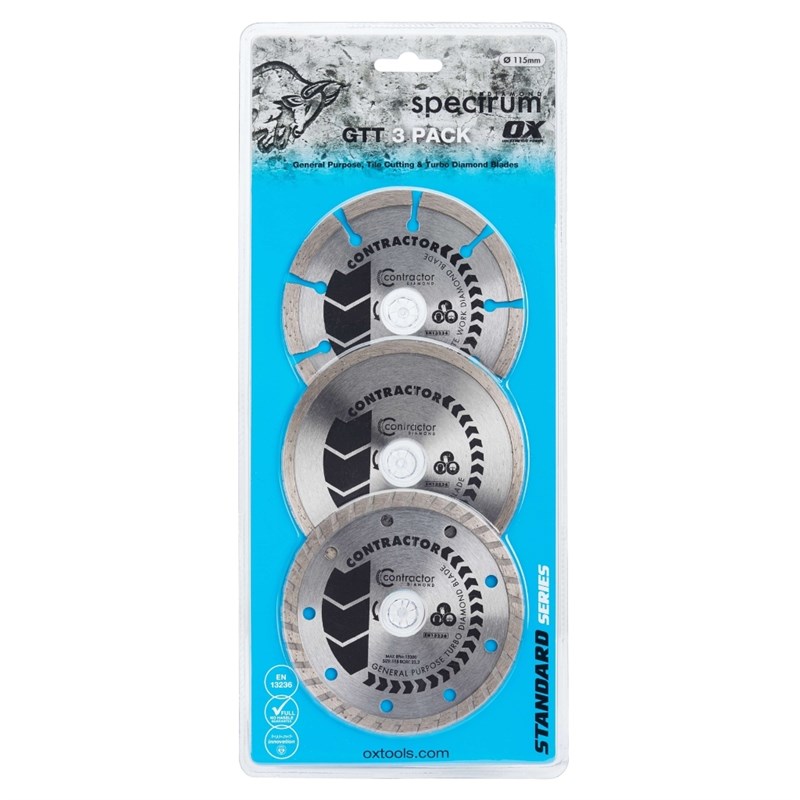 The OX X3-GTT-115-22 Spectrum Contractor GTT Diamond Blade (Triple Pack) is a versatile cutting solution designed to meet a wide range of general purpose cutting requirements. It highlights a three-blade pack that includes General Purpose, Turbo and Ceramic blades, providing flexibility across multiple materials and applications. Ideal for trade and site use, it delivers reliable performance for everyday cutting tasks.