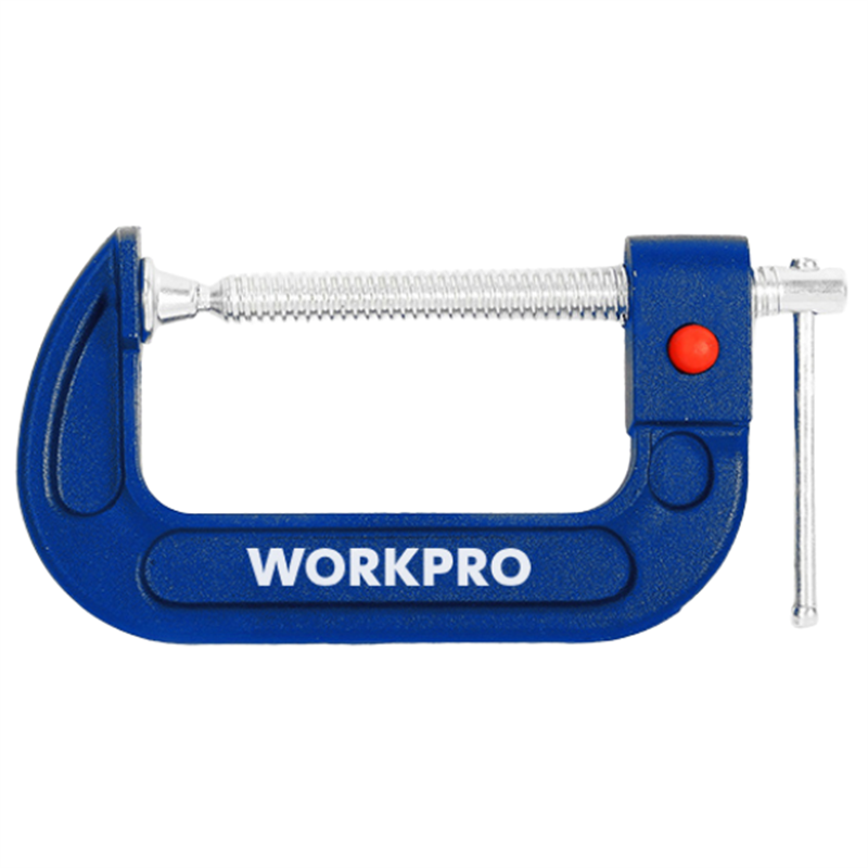 The WORKPRO WP232023 Quick Release C Clamp is a light‑duty, fast‑acting clamp designed for convenient holding and positioning in DIY and general workshop tasks. Featuring a quick‑release red button, it opens and closes rapidly to speed up set‑ups, while the malleable cast‑iron frame and steel components provide dependable strength with a powder‑coated finish for corrosion resistance. A chrome‑plated, cold‑drawn steel spindle with rolled threads ensures smooth, consistent tightening, and the swivel pad distributes pressure evenly across the workpiece. An oversized T‑handle delivers extra torque and precise control.