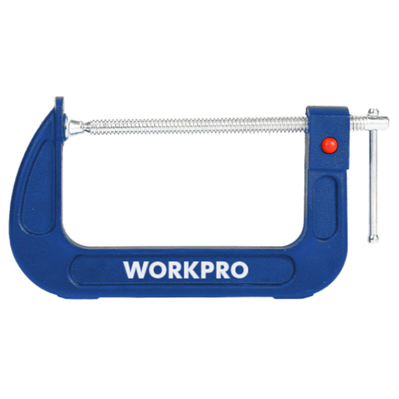 The WORKPRO WP232024 Quick Release C Clamp is a light‑duty, fast‑acting clamp designed for convenient holding and positioning in DIY and general workshop tasks. Featuring a quick‑release red button, it opens and closes rapidly to speed up set‑ups, while the malleable cast‑iron frame and steel components provide dependable strength with a powder‑coated finish for corrosion resistance. A chrome‑plated, cold‑drawn steel spindle with rolled threads ensures smooth, consistent tightening, and the swivel pad distributes pressure evenly across the workpiece. An oversized T‑handle delivers extra torque and precise control.