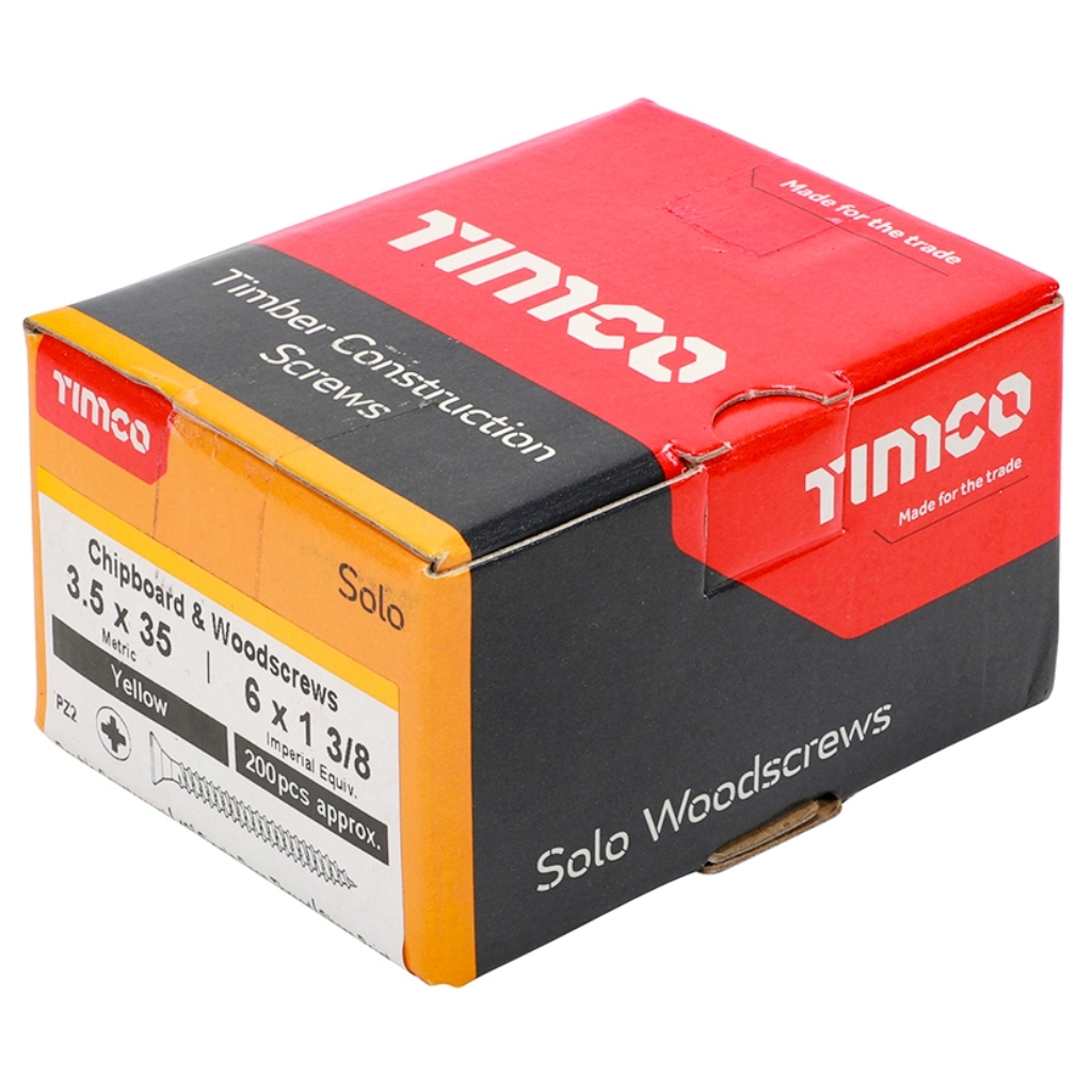 The TIMCO 35035SOLOC Solo Chipboard & Woodscrew is a versatile single thread fixing designed for use in timber, man-made boards and masonry with a plastic plug. It highlights fast insertion and strong holding power with a sharp point and deep thread, while the wax lubrication improves driving performance and corrosion resistance. Ideal for general construction and joinery applications requiring reliable and efficient fixing.