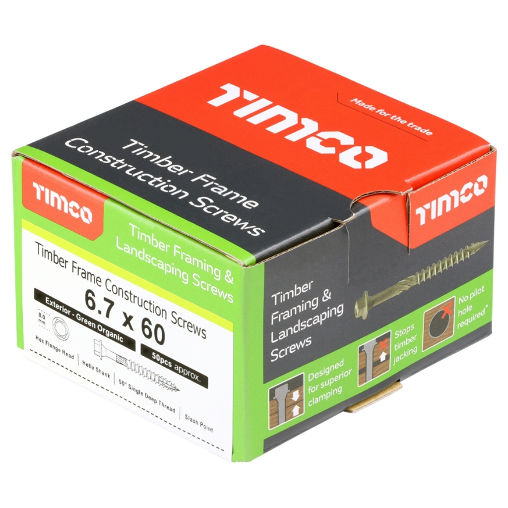 The TIMCO 60IN Green Organic Exterior Hex Timber Frame Screw is a high-performance alternative to traditional coach screws, designed for secure timber to timber applications. It highlights a patented multi-layer corrosion resistant plating tested to withstand up to 1,000 hours salt spray, making it ideal for external use. Engineered for strength and efficient installation, it delivers reliable clamping performance in structural timber projects.