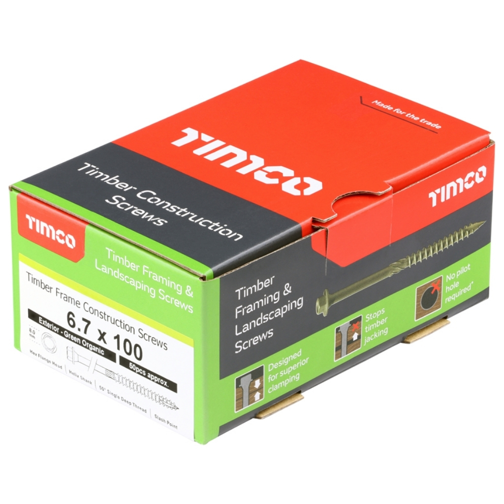 The TIMCO 100IN Green Organic Exterior Hex Timber Frame Screw is a high-performance alternative to traditional coach screws, designed primarily for timber to timber applications. It highlights a patented multi-layer corrosion resistant plating tested to withstand up to 1,000 hours salt spray, making it ideal for demanding external environments. Engineered for strength, speed and durability, it delivers secure fixings with enhanced insertion performance.