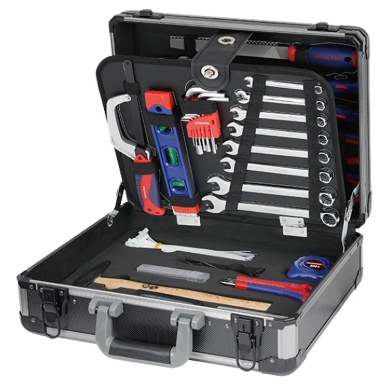 The WORKPRO WP209031 297‑Piece Tool Kit with Aluminium Case is a comprehensive, multi‑layer toolkit for home, auto and workshop repairs. Packed in a durable aluminium trolley case, it combines sockets, spanners, pliers, screwdrivers, a hammer, hex keys, cutting tools and fasteners, giving you an organised, go‑anywhere solution for most everyday fixes and maintenance.