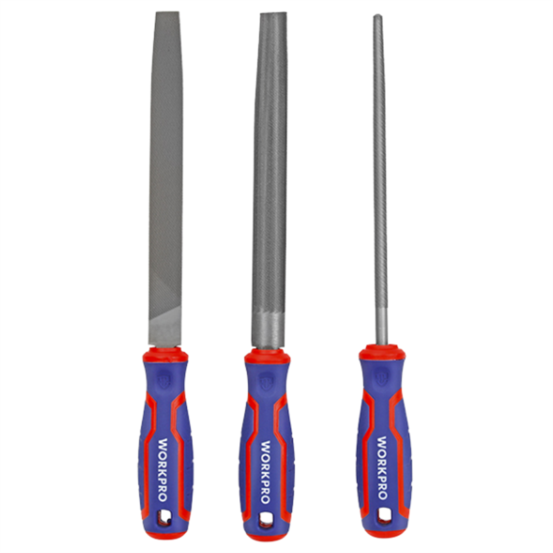 The WORKPRO WP201702 3‑Piece File Set 200 mm is a versatile kit for shaping, smoothing, and deburring across metal, wood, and plastics. Made from durable T12 tool steel with ergonomic bi‑material handles, the set includes flat, half‑round, and round profiles to tackle flat faces, curves, and holes with control and comfort in workshop or DIY tasks.