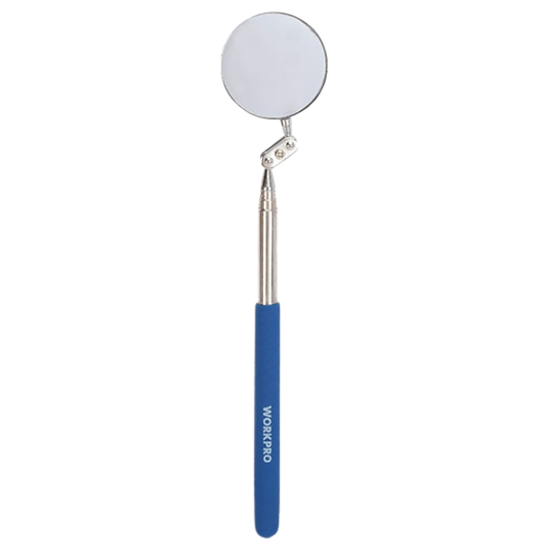 The WORKPRO WP319009 Telescopic Inspection Mirror features a 50 mm circular mirror on a steel telescopic shaft that extends from roughly 175 mm up to 720 mm. A ball‑joint head provides flexible viewing angles, making it easy to inspect tight or concealed areas. Compact and durable, it’s useful for automotive diagnostics, maintenance and general inspection tasks.