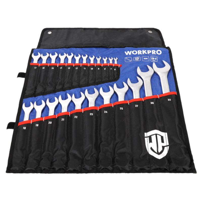 The WORKPRO WP202504 23‑Piece Combination Wrench Set is a comprehensive metric spanner kit crafted from heat‑treated chrome‑vanadium steel for strength and durability. Sand‑blasted and chrome‑plated for corrosion resistance, each wrench features an open end for quick turning and a 12‑point box end for secure, high‑torque fastening. Covering sizes from 6 mm to 32 mm, it’s ideal for automotive, machinery, and general maintenance.