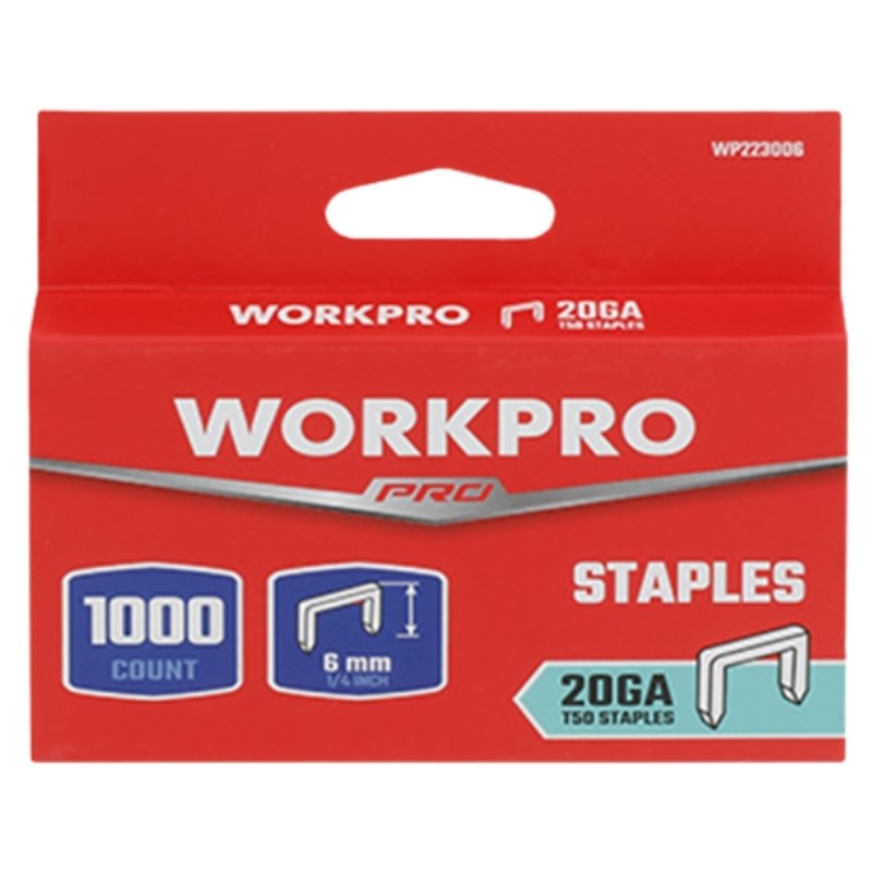 The WORKPRO WP223006 T50 Staples 6 mm (1/4") are light‑duty staples for manual and electric T50‑type tackers. Made from galvanised steel and supplied 1000 per pack, they’re ideal for fixing thin materials like fabrics, foils and labels to softwood and board.