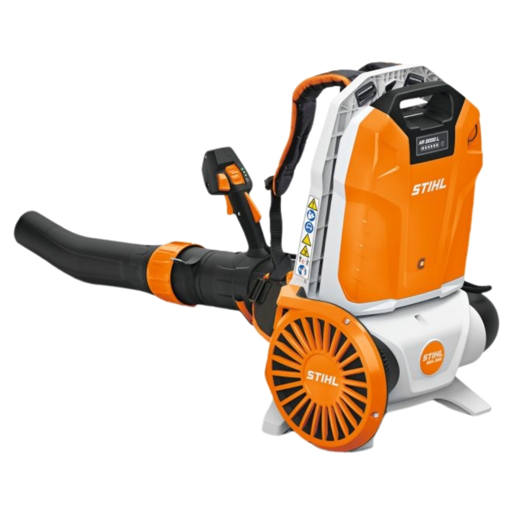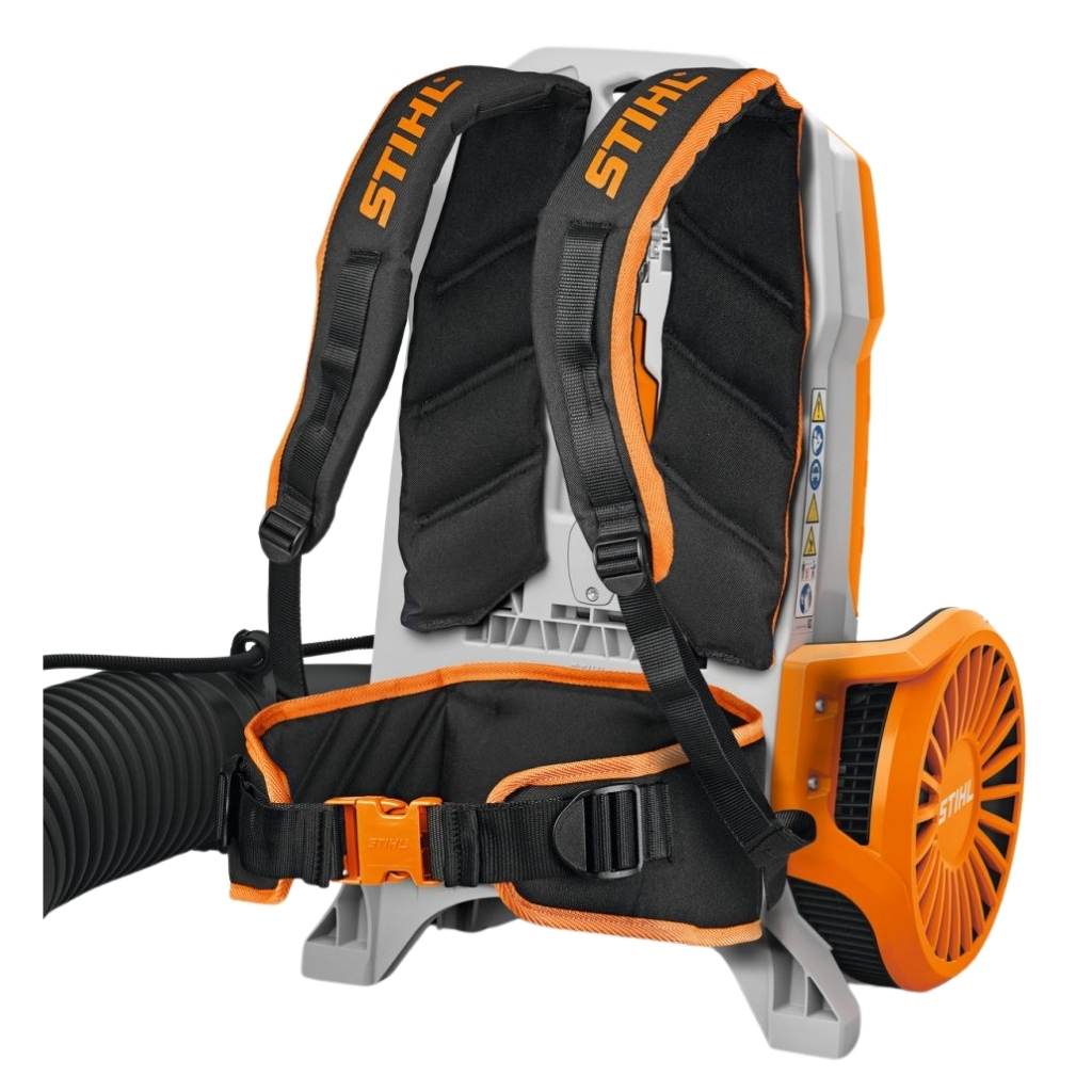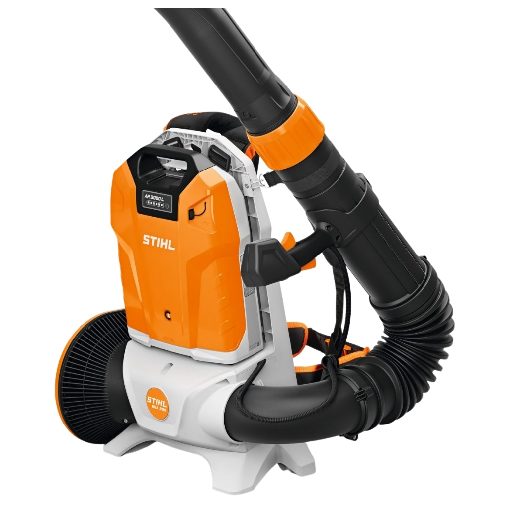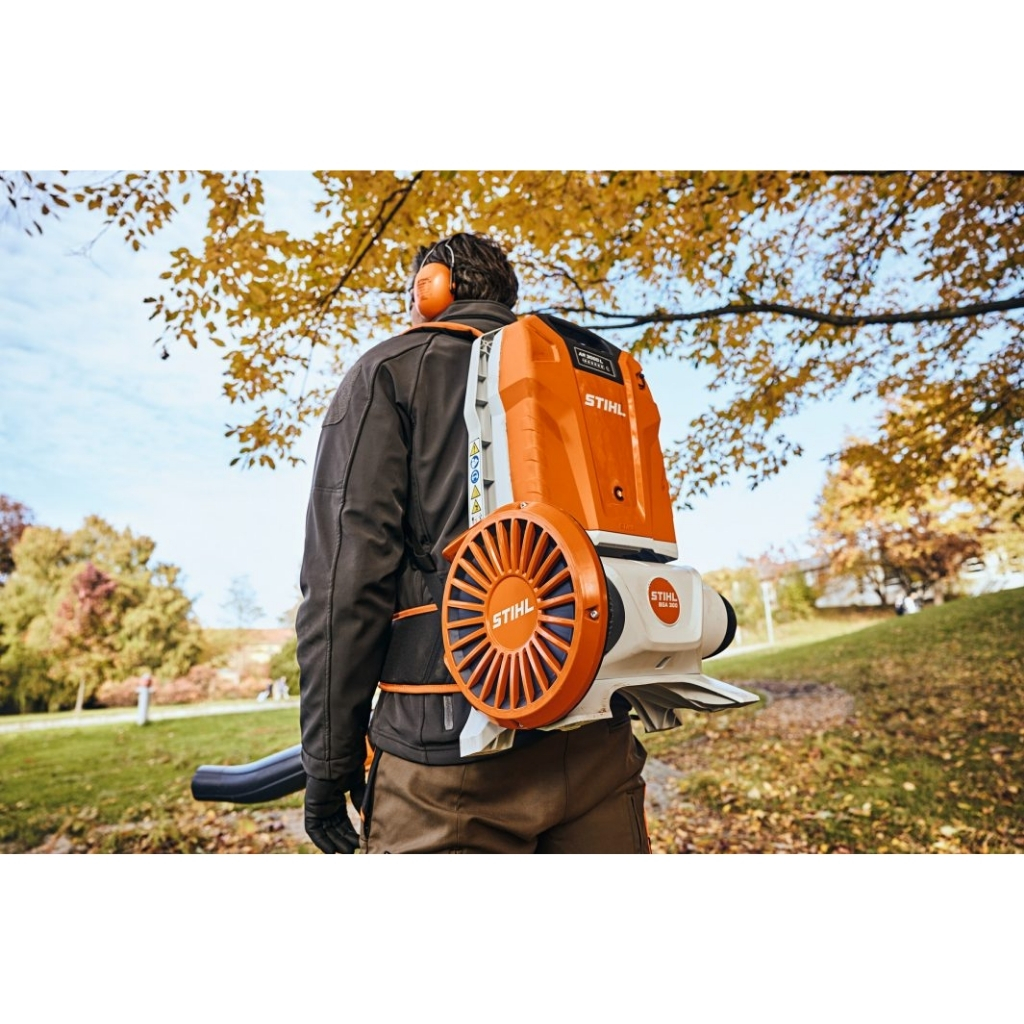 The Stihl BA03-011-5910 BGA 300 Cordless Backpack Blower is a professional battery-powered blower from STIHL, designed for efficient cleaning of large areas, even with wet and heavy leaves, in noise-sensitive environments. It highlights petrol-level blowing force with reduced noise output, four adjustable power levels with boost mode, and ergonomic backpack design with padded shoulder straps and hip belt for comfortable long-term use.