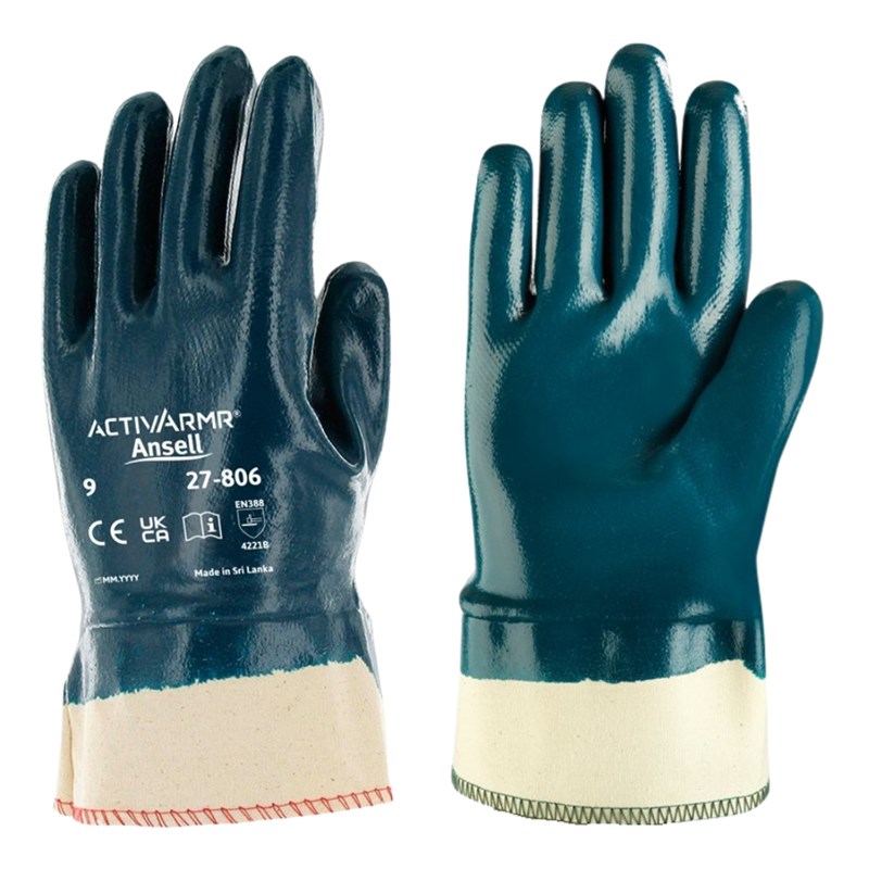 The Ansell 27-806 Activarmr Heavy Duty Nitrile Gloves (Pair) are robust, fully nitrile-coated gloves designed for demanding industrial tasks. They offer excellent protection against oils, greases, and abrasions, making them ideal for heavy-duty applications in automotive and metal fabrication industries.