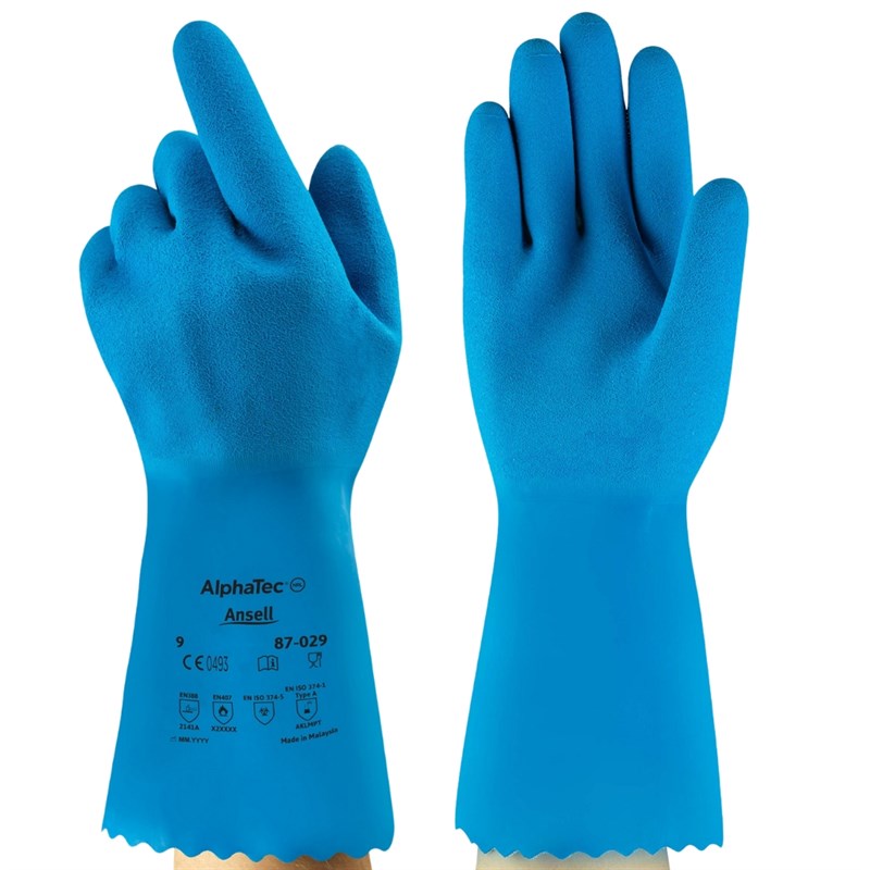 The Ansell 87-029 AlphaTec Natural Rubber Gloves (Pair) are designed to provide exceptional protection, dexterity, and comfort for a variety of tasks, including chemical handling, food processing, and general cleaning. Featuring a natural rubber latex coating and a seamless nylon liner, these gloves ensure a secure grip and reliable performance. Ideal for chemical handling, food processing, janitorial services, and general cleaning tasks where hand protection against chemicals, heat, and food-safe conditions is essential.