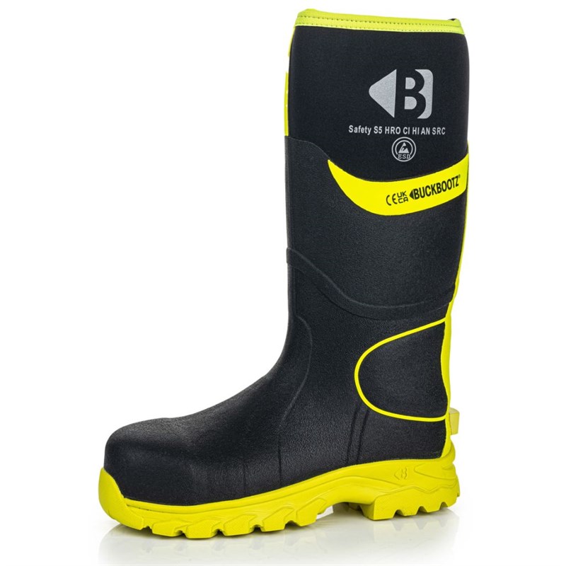 The Buckbootz BBZ8000BKYL S5 SRC Safety Wellington Boots use a completely different assembly process from its older brother, BBZ6000 plus a host of new safety features and lightweight components. In addition it's 360º reflective, non-metallic and has built in EN certified ankle impact protection (AN) and Achilles support. BBZ8000 features a super lightweight nano safety toecap, a lightweight anti-penetration midsole and a weight saving sole bonding process. It's comparable in weight to its moulded polyurethane competitors and just like its older brother it fits like a glove, not like a tube.